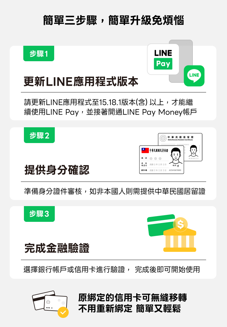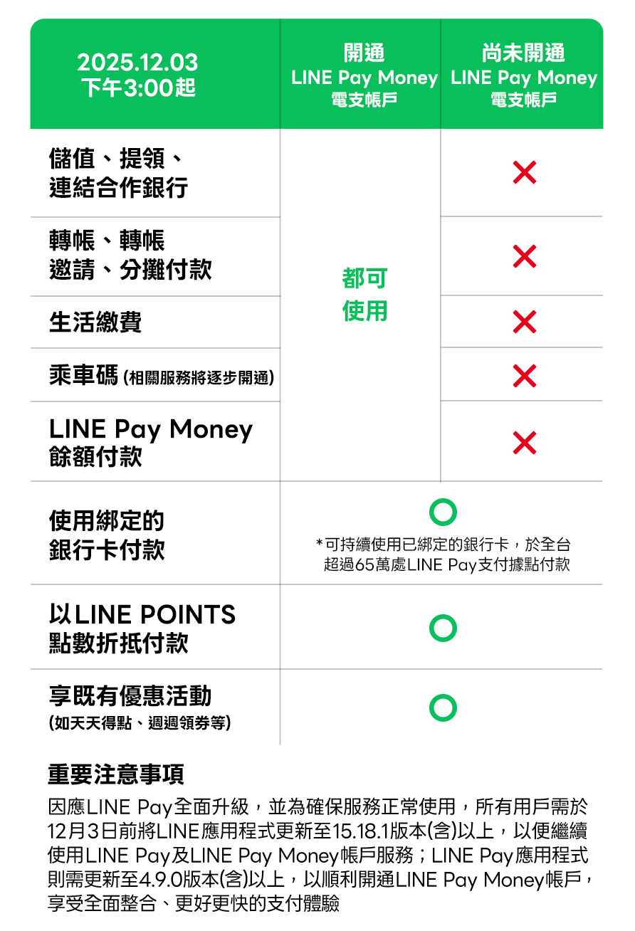 Ans: 自2025年12月03日起LINE Pay服務將正式營運新一代LINE Pay Money帳戶,提供電子支付帳戶服務,為能讓您體驗全新的LINE Pay,建議您可將LINE App更新至最新版本,完成版本更新後即可開始使用。