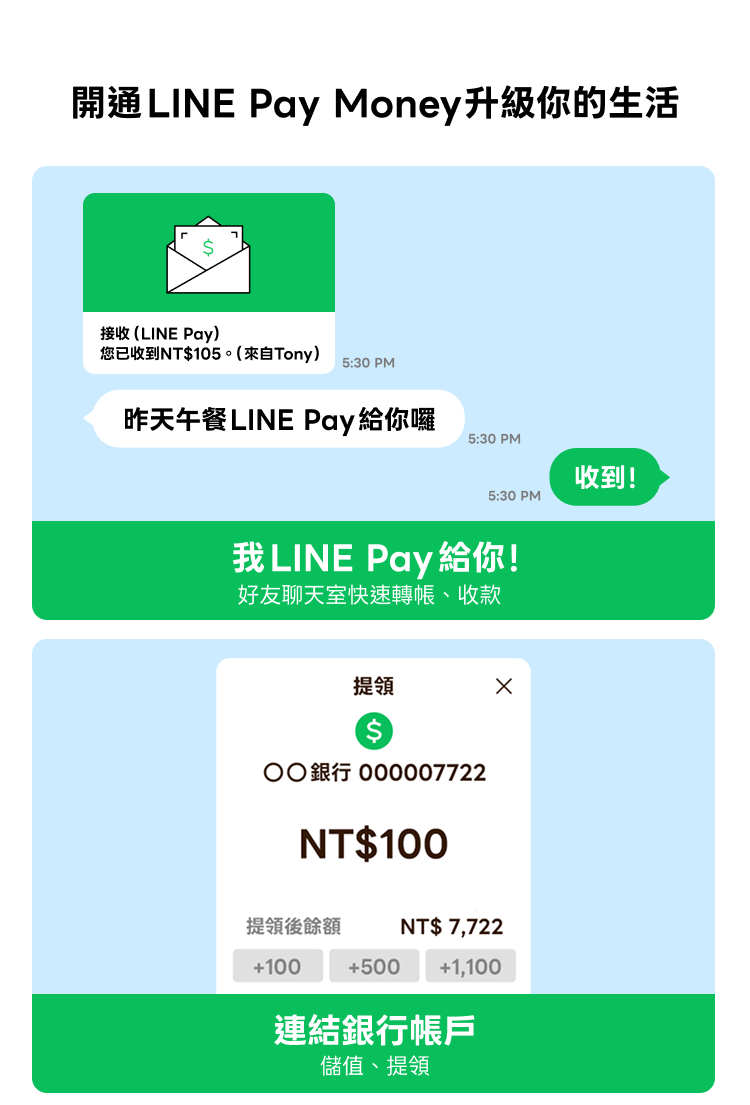 請您完成LINE Pay Money帳戶註冊後,盡快連結您的個人銀行帳戶,並將餘額重新儲值至LINE Pay Money帳戶中,就可透過LINE Pay Money帳戶使用付款、轉帳、繳費等功能。