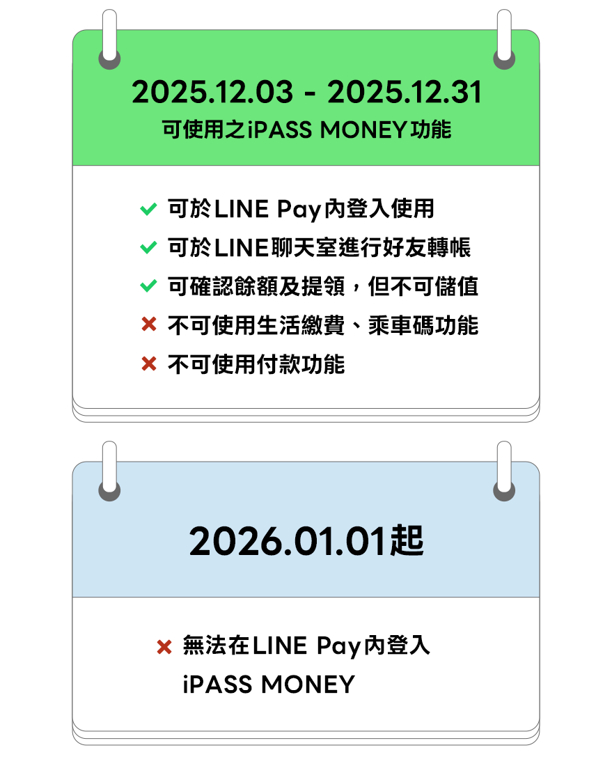 您在iPASS MONEY帳戶綁定的生活繳費項目,敬請留意繳費時間,12月3日起LINE Pay將不再發送iPASS MONEY通知。