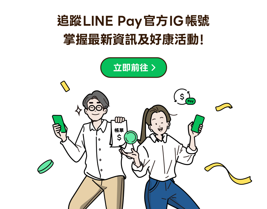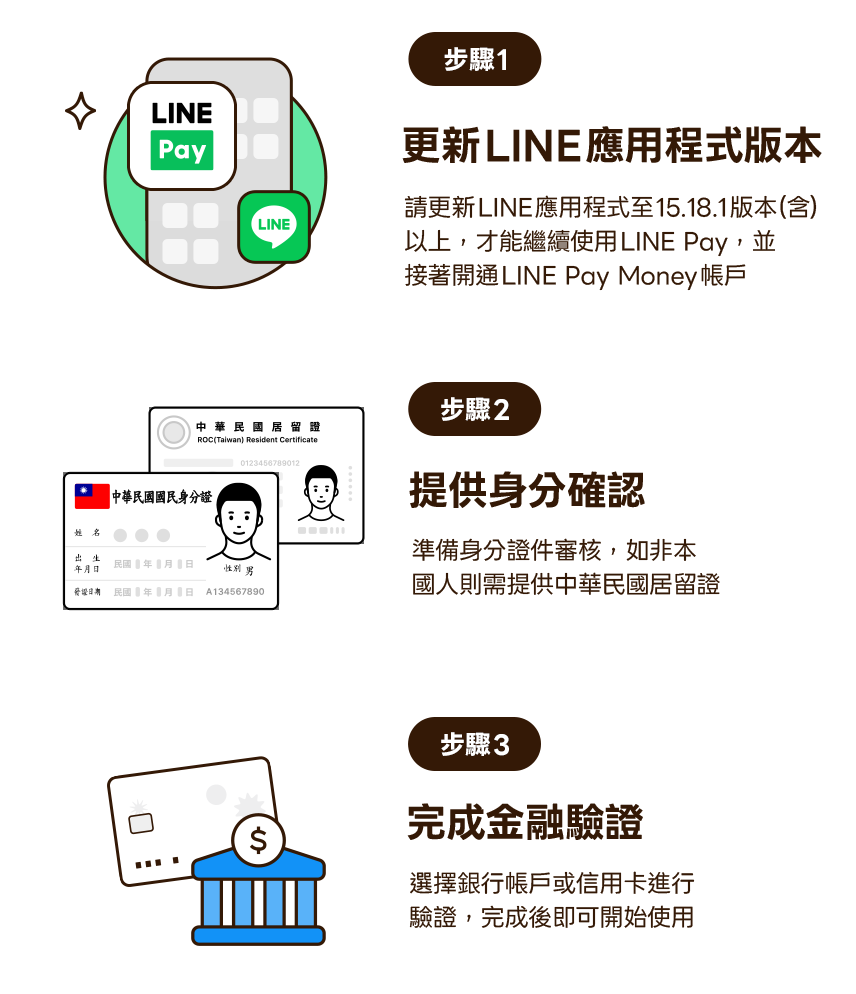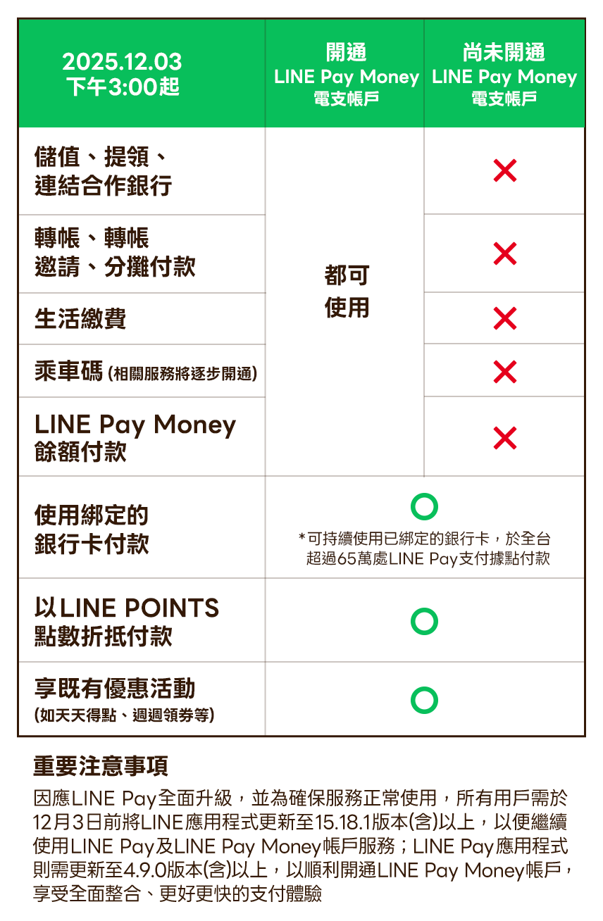 為能更完整地體驗全新的 LINE Pay,建議您可將 LINE 應用程式 更新至最新版本,開啟 LINE 應用程式 裡的 LINE Pay,或是透過 LINE Pay 應用程式 立即完成 LINE Pay Money 帳戶開通,即可使用服務。