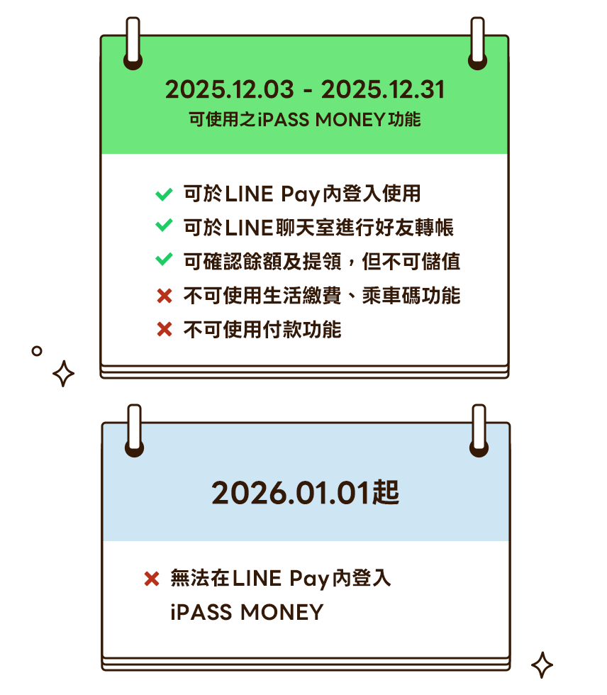 2026年1月1日起,LINE Pay介面將不再提供iPASS MONEY服務連結。
